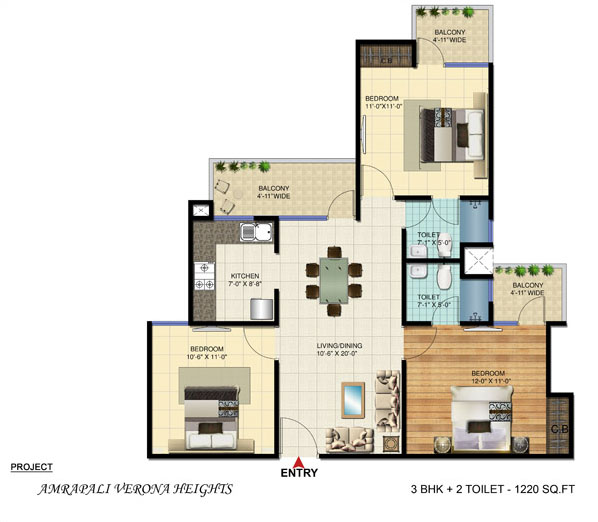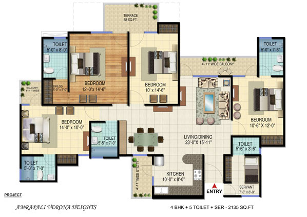 Walls : Granite tiles cladding upto 3 Ft. and texture paint above. |