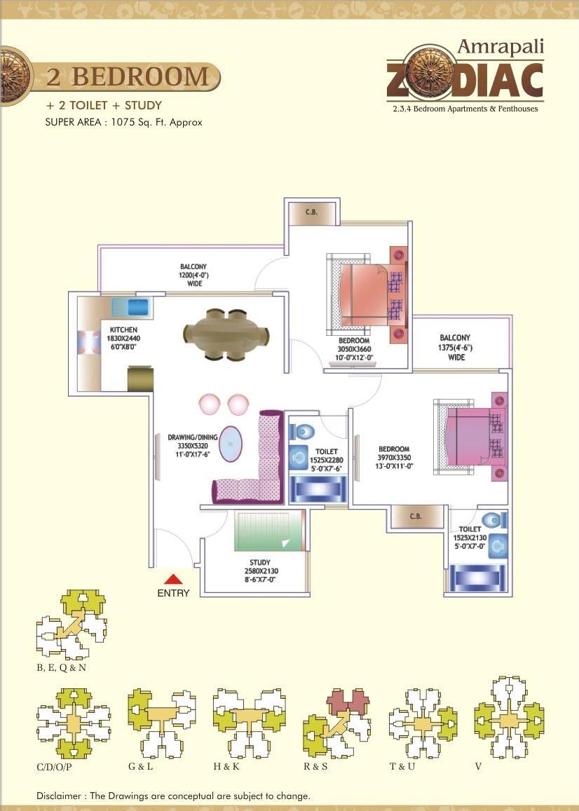 2 Toilet + Study Super Area : 1075 Sq. Ft. Approx