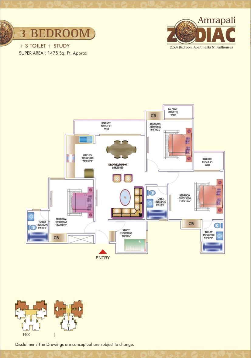2 Toilet + Study Super Area : 1475 Sq. Ft. Approx