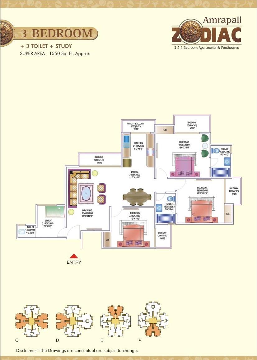3 Toilet + Study Super Area : 1550 Sq. Ft. Approx
