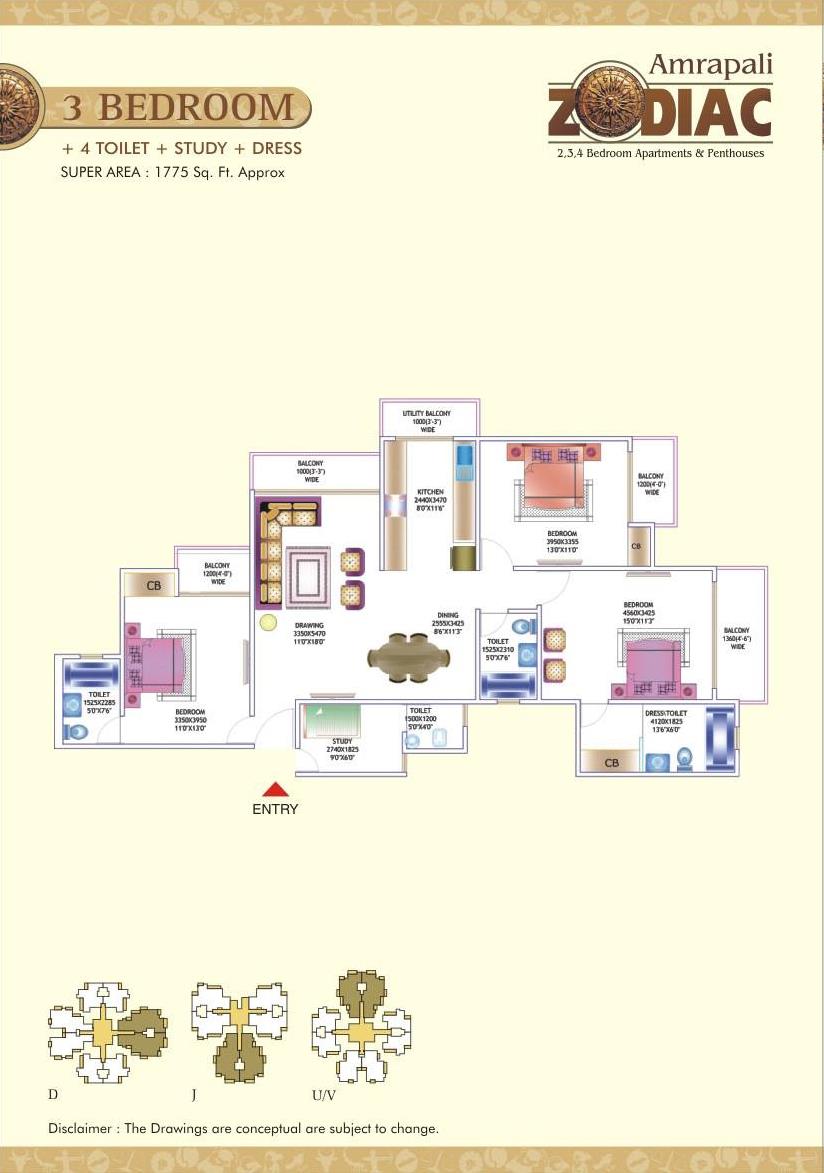 4 Toilet + Study + Dress Super Area : 1775 Sq. Ft. Approx