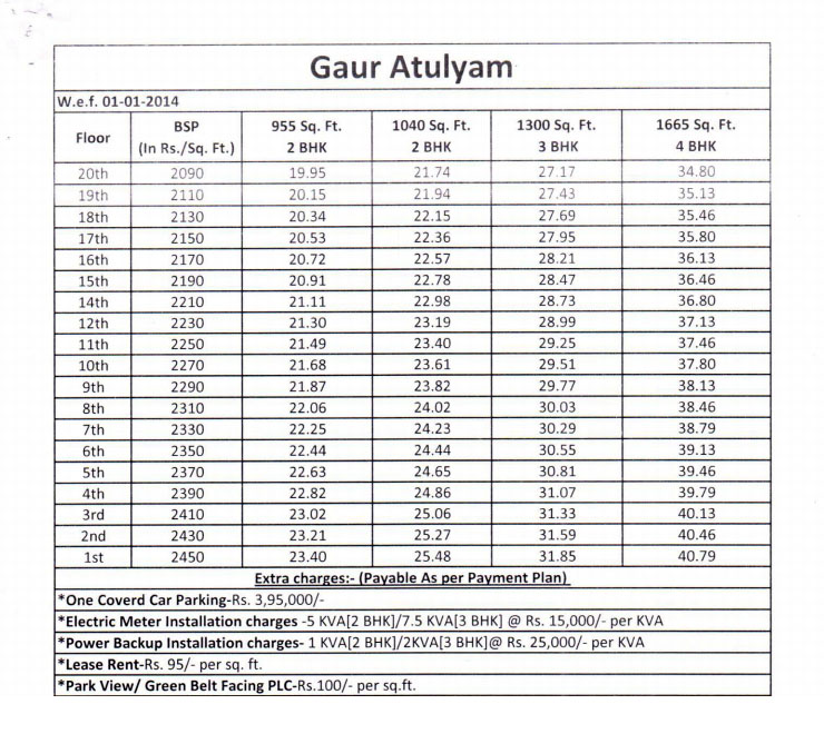 After spreading the fineness in various regions of Noida, Noida Extension, Yamuna Expressway, Gaur Builders are coming up in Greater Noida with their brand new launch Gaur Atulyam presenting excellently planned 2,3,4 BHK Apartments with phenomenal detailing, interiors and architecture. Keeping the legacy of their past projects intact and strong, Gaursons Builders are now configuring the homes with latest of the features, facilities and amenities by side. Gaur Atulyam Omicron One Greater Noida is finely placed amidst the most wanted locations of NCR. All the amenities in close location are in usable conditions which promise a great life to all its residents. Formula One race track, Noida – Greater Noida Expressway, Pari Chowk and upcoming Metro station are very near to this upcoming township delivering comfy and plush at the same time. 2/3/4 BHK Flats in Greater Noida are available here in Gaur Atulyam are of variable sizes. Starting at 955 sq. ft., the spaces almost range to 1665 sq. ft. for a 4 BHK apartment. The compound of this project will be equipped with large expanse of greenery, jogging tracks, Swimming pool, Gymnasium, Kid's Play area, Health facilities and several other features important for leading a comfortable life. Gaur Atulyam is being built as per highest construction norms. Created in an Earthquake Resistant RCC Structure, every flat has access to round the clock power backup and24x7 water supply. Floorings are vitrified tiles in drawing, dining, kitchen & entrance lobby with designer marbles in all bedrooms and ceramic tiles in toilets & balconies. POP plaster finished walls & ceiling with design decorate every flat. Toilets have branded washbasin, branded E W C, CP fittings, Mirror & towel rack. Electricity is provided in copper wire in PVC conduits with MCB and adequate power and light points. Live life Congestion Free only at Gaur's latest innovation in Greater Noida !!! |